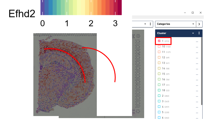 我们可以看到,最红的点,也就是Efhd2表达量最高的spot都集中在这一个弧线上。